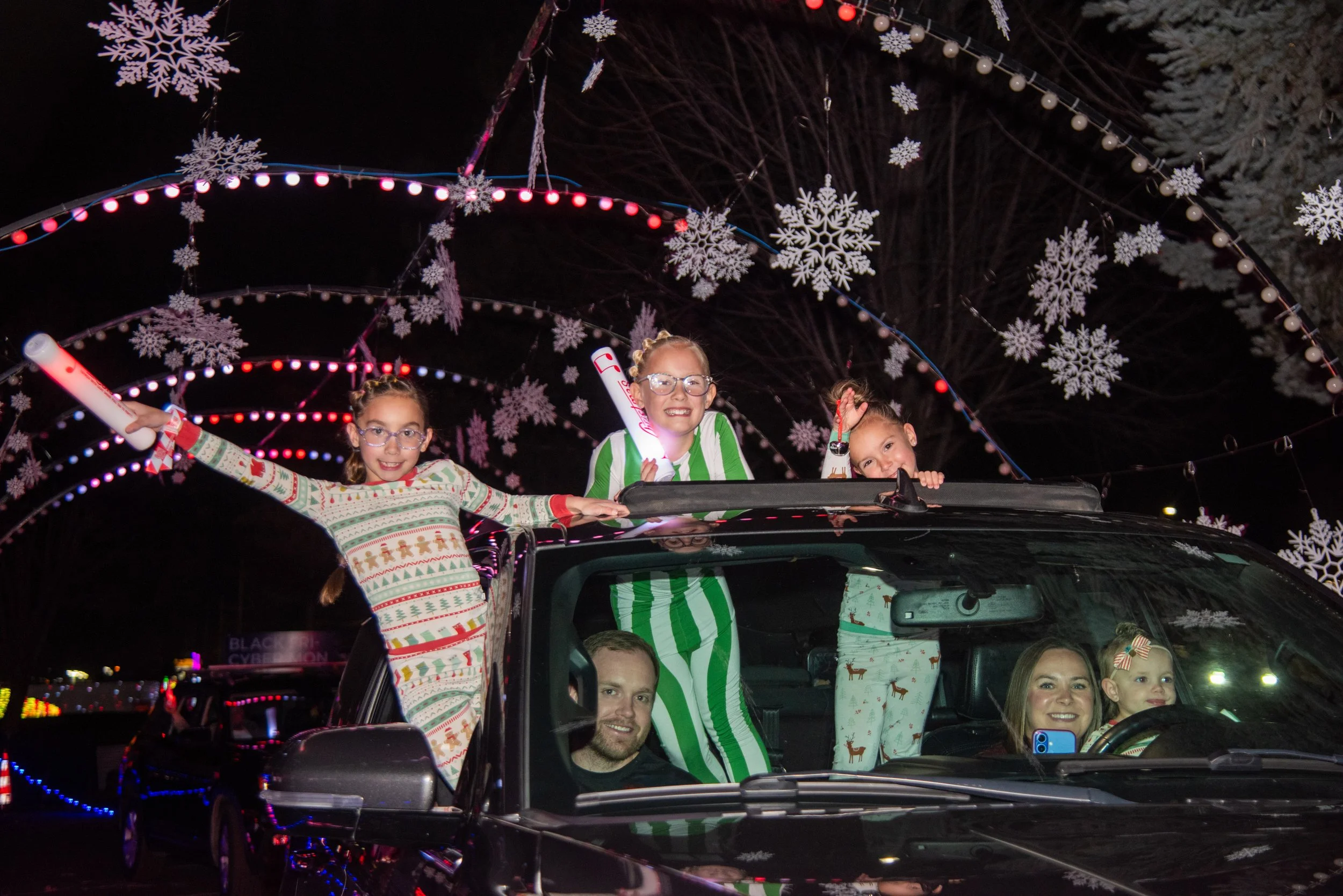 2 pairs of glasses, 2 synchronized light sticks, bracelets, a believe bell, stickers and more festive fun for everyone in the car.